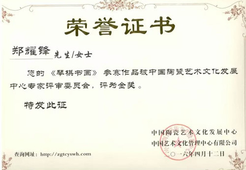 作品《琴棋书画》2016年荣获中国陶瓷艺术文化发展中心评审委员会评定为金奖