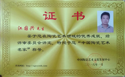 江国兴:1968年生于景德镇,江西省高级技师(国家一级),江西省工艺美术师、高级工艺美术师。江西省工艺美术协会会员,1990年毕业于中国书画函授大学,2014年毕业于景德镇陶瓷学院。景德镇国汇陶瓷艺术名家协会会员、景德镇美术家协会会员、中国陶瓷艺术文化发展中心会员、景德镇市技工学校陶瓷美术专业客座教授、景德镇珠山美术家协会会员。作者在二十多年的陶瓷绘画创作中,他平静执着的追求自己的陶瓷艺术风格。将西方的色彩光影等技巧同瓷画的笔墨关系紧密地结合在一起,成功的形成了自己独特的陶瓷绘画语言,其作品造型严谨、形象生动、构图多变、色彩绚丽、兼工带写、清新秀美、幽静雅致、优美大方。