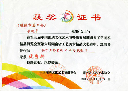 其作品多次参加省市画展,深受许多爱好者喜欢和收藏。 其作品釉下五彩瓷瓶《山谷牧歌》获2015年湖南省第六届工艺美术精品大赛优秀奖。 其作品釉下五彩瓷瓶《醉卧仙岳渌水长流》获2016年第七届湖南省工艺美术精品大赛铜奖。 其作品釉下五彩瓷瓶《饮马云水间》获2017年中国工艺美术协会举办的“深圳·金凤凰”工艺品创新设计大赛银奖。 2017年经中国陶瓷艺术文化发展中心专家评审委员会评定为“中国陶瓷艺术名家”