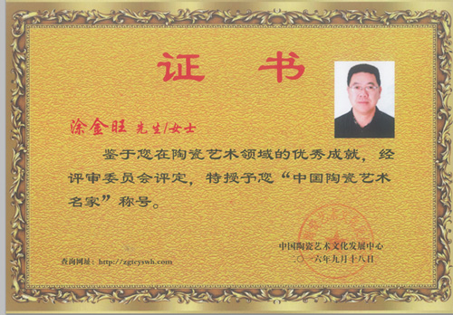 个人简介: 涂金旺:福建德化,从艺简历 1995.1-2000.1 德化万强陶瓷有限公司,2000--至今创办旺柏陶瓷工作室