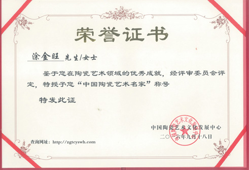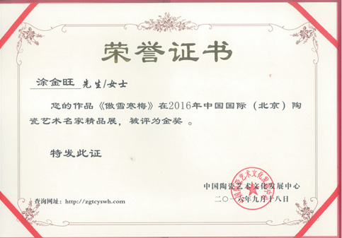 获奖作品简介:2010.7 第八届中国工艺美术博览会暨收藏“博览会金奖” 2015.3 北京第三十一届国际礼品展览金奖 2015.4 获深圳“金凤凰”杯工艺创新设计奖“铜奖” 2017年经中国陶瓷艺术文化发展中心专家评审委员会评定为“中国陶瓷艺术名家”