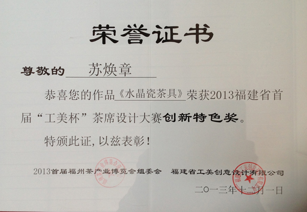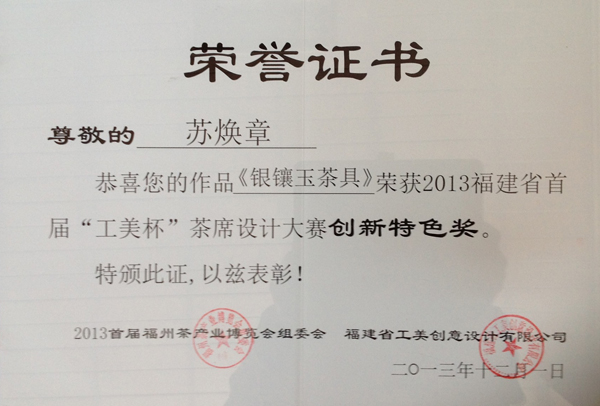 2013年12月1日,作品《银镶玉茶具》荣获2013福建省首届“工美杯”茶席设计大赛创新特色奖。作品《水晶瓷茶具》荣获2013福建省首届“工美杯”茶席设计大赛创新特色奖。