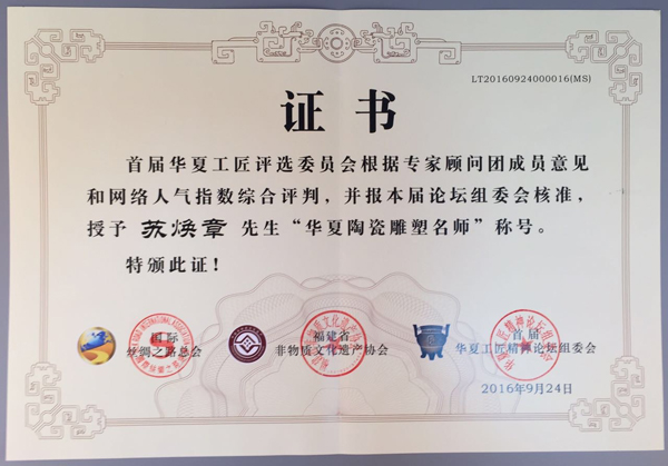 2016年9月被福建省非物质文化遗产协会授予“华夏雕塑名师”称号。