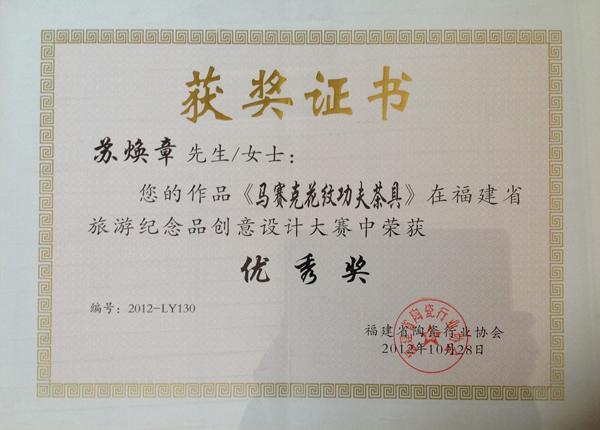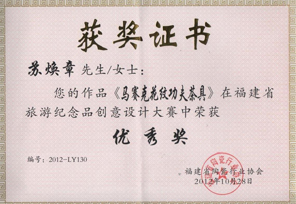 2012年10月28日,作品《马赛克花纹功夫茶具》荣获福建省旅游纪念品创意设计大赛优秀奖。