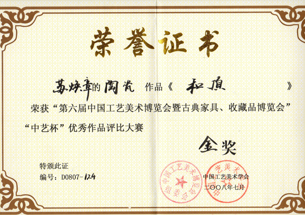 2008年7月,作品:《和顶》荣获“第六届中国工艺美术博览会暨古典家具。收藏品博览会”“中艺杯”优秀作品评比大赛金奖;
