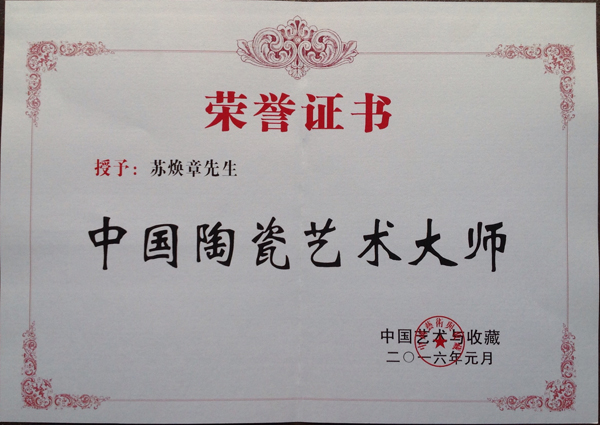 2016年1月被中国艺术与收藏授予“中国陶瓷艺术大师”称号。