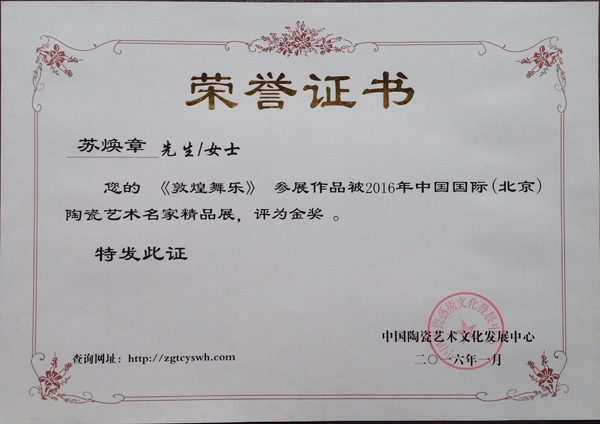 2016年1月,作品《敦煌舞乐》荣获2016年中国国际(北京)陶瓷艺术名家精品展金奖。