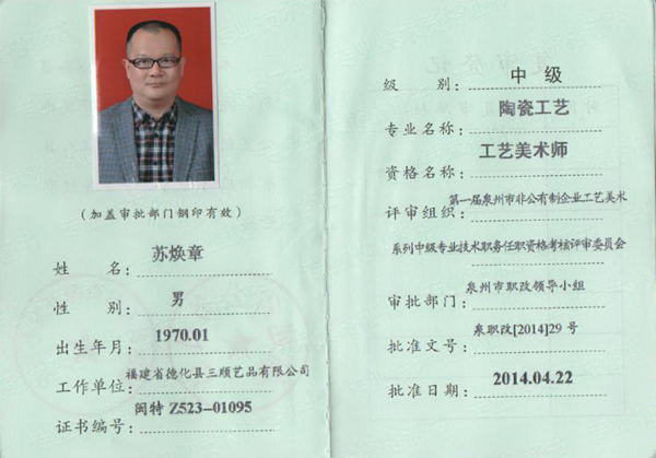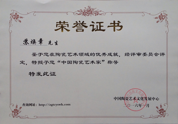 2016年1月被中国陶瓷艺术文化发展中心授予“中国陶瓷艺术家”称号。