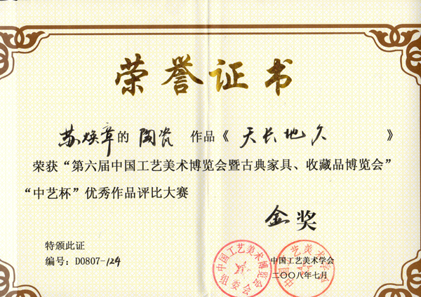 2008年7月,作品:《天长地久》荣获“第六届中国工艺美术博览会暨古典家具。收藏品博览会”“中艺杯”优秀作品评比大赛金奖;