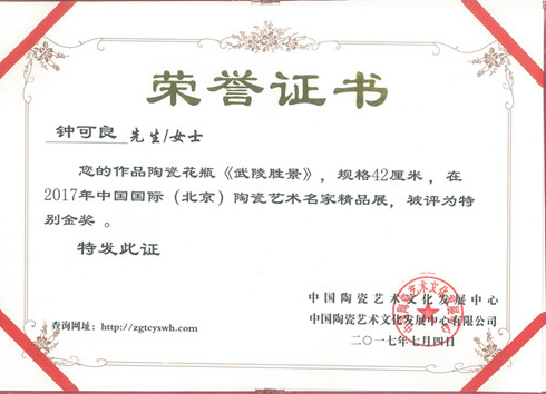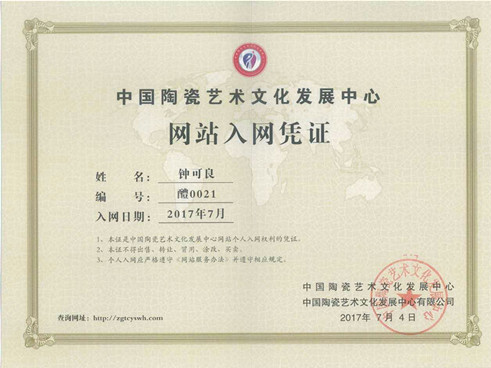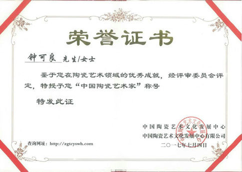 个人简介: 钟可良:男,1969年出生于醴陵,自幼喜爱书画艺术,1993年先到湖南省书画系、96年就读于浙江美院学习,从事釉下五彩创作二十余年,师从中国陶瓷艺术大师易炳萱先生门下。擅长山水,走兽等,2017年加入中国陶瓷艺术文化发展中心,经中国陶瓷艺术文化发展中心专家委员会评定为“中国陶瓷艺术家”。