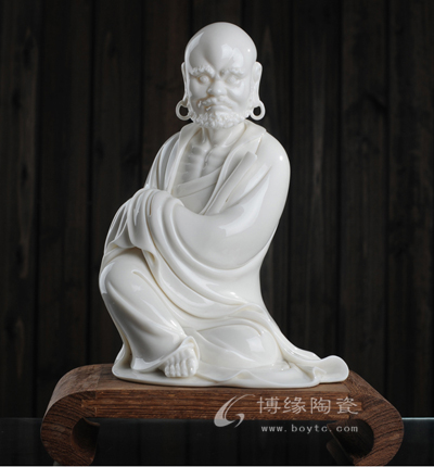 【产品名称】:持经达摩 【产品瓷质】:白瓷 【产品分类】:人物瓷塑 【产品件数】:1件 【产品釉色】:白釉 【产品花面】:纯白无花面 【推荐等级】:★★★★★ 【原 产 地】:福建德化 【上市年份】:2014 【产品包装】:锦盒 【规格说明】:长宽高:15*13*23.5(cm) 【产品工艺】:高级象牙白瓷泥1300以上高温烧制 【产品简介】:《》以德化特有的温润如玉的“中国白”为胎质,纯手工制作,所塑人物性格鲜明,造型优美,神态逼真,风格洗练。