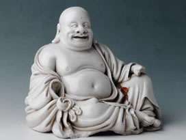 泉州市博物馆藏有一件德化窖瓷塑弥勒,身高22厘米,宽18厘米,呈趺坐式,弥勒双手置膝,袒胸露腹,坐姿俯仰有致,神态端庄慈祥,坐像后背钤有“何朝宗印”四字访章款。