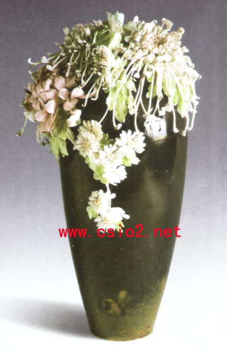 作者创造性地在瓶子上捏花,突破了过去都是做在花架、花蓝里的传统。为了让花能像真花那样自然悬空伸展,有起有伏、有藏有露,而不是平贴在瓶子上,需要克服很多技术上的难题。作者选择了造型优美的梅瓶,捏塑了几种有代表性的菊花。制作时分成错落有致的几个组,一层层像开花每个花瓣的生动形象,又要有整体效果。乌金釉瓶把菊花衬托得分外艳丽。