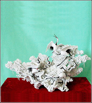 夸张简洁,神态悠扬,色泽明朗,既有传统瓷雕的吉祥寓意,又有时代趣味。