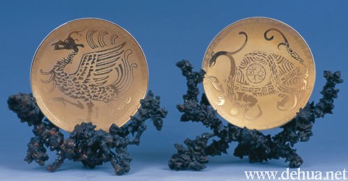 《腐蚀金四方四神艺术挂盘》,创作于2002年5月,荣获第三届福建省工艺美术精品“争艳杯”大赛优秀奖。