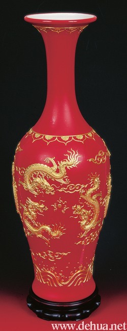 《辣椒红浮雕九龙花瓶》,创作于1998年10月,荣获第三届中国工艺美术精品博览会金奖。
