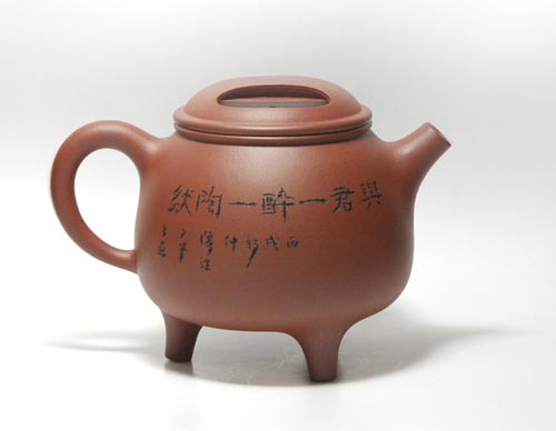 · 三足牛盖宝鼎壶,以“鼎”为创作主题,以“土”为本体语言,融自然之型与艺术之魂为一体,浓厚的历史,岁月积淀的文明,均在线条的承转合宛里渐次苏醒。三足顶立,壶身巍巍。泥色清纯柔细,些微光泽隐没。壶盖的造型巧心独具,如牛张鼻孔,凝神时似闻嗬嗬声。流与把的探出收回,似书法的起手与收势,有酣然流畅美态。