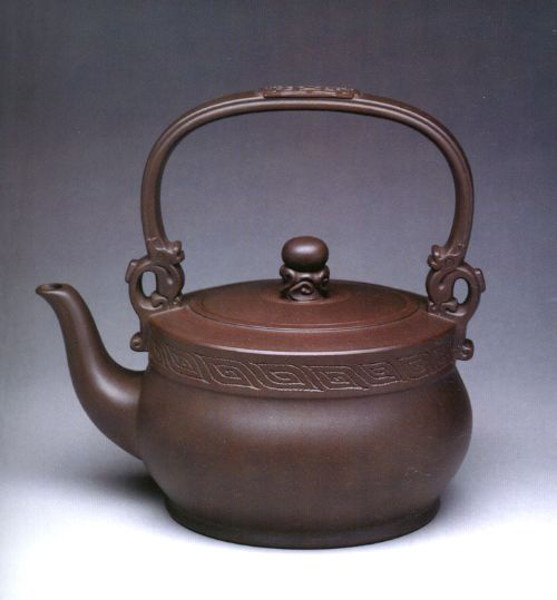 《天龙戏珠提梁壶》壶形似仿古铜器,敦厚朴质,线条流畅利落。提梁圆而方,与肩衔接处化为龙形,自然而适得其意,与盖上的珠状的,即为双龙戏珠为此壶的重点。流顺壶势伸出,由粗至细,长而挺拔,使此壶在简单中而暗藏玄机,意义深厚。