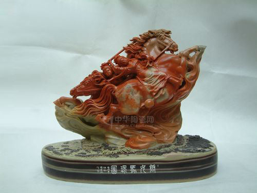 这件作品是迎奥运而雕刻的 “唐女马球图”。唐代长安城内的马球运动曾风靡一时,还有皇家专门的马球队。唐玄宗就曾率领皇家马球队击败过来访的波斯马球队,这在史籍上有记载的,说明中华民族在古代就喜爱体育运动。作品以青田名贵封门红花精制而成,表现两个唐女骑在马背上有相互争斗呼应的场面。两人两骑,一繁一简,一主一从,虚实轻重,马的刚猛,仕女的柔美,一刚一柔形成对比强烈的生机和意趣。