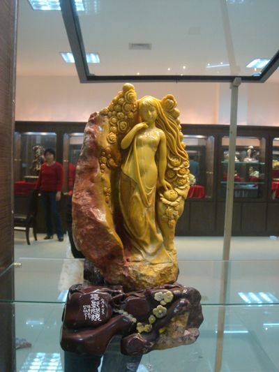 《花影妖娆》采用封门红花精雕而成,取黄色为人为花,背景保持原石原貌,以突出主题。作品中人物与花卉相映成辉,相互穿插,着刀处抓形见神,不着刀处留以更多的遐想。