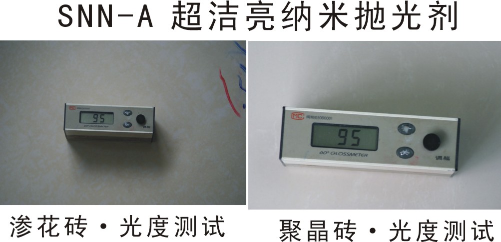 众所周知,抛光砖抛光之后表面气孔的暴露,很容易导致两个问题:吸污和光泽度差。再好的抛光砖都会存在这两大问题,即使打蜡也很难从根本上解除这种顾虑,而且除蜡又是很麻烦的事。 针对陶瓷防污和光泽度提高这两个难题,纳诺科技自主研发出行内最先进的具有重大突破性的先进技术:超洁亮技术!一、产品简介 SNNA 抛光砖专用纳米抛光液是我司采用纳米技术,专业针对目前抛光砖,经抛光之后表面气孔的暴露,很容易导致两个问题:吸污和光泽度差而开发的高科技产品。 可以在超白砖、渗花砖、微粉砖等各类陶瓷抛光砖表面形成一层具有特殊防护功能且结构稳定的纳米级保护层,其材料粒度小至纳米级,完全填补砖面的气孔和微裂纹,同时大幅提高砖体的光洁度,使瓷砖表面的光泽度可达90度以上,接近镜面效果,通透晶莹。形成的保护层与砖坯紧密结合,有效抗磨损保护层材料颗粒之间以及材料和砖坯之间紧密的分子键结构,也保证砖体具极强的抗磨性,长期使用仍保持光洁如新。也提升陶瓷抛光砖的抗污性能。 二: 特性 1 镜面镀膜强力增亮,通透晶莹。 2 光度均匀,平均光度达90度以上。 3 充分填补砖面的气孔和微裂纹,形成三围网状分子结合的牢固结构,膜层坚硬、耐刮、耐磨擦性能佳,砖面不易被刮花.长久保持砖面完整,产生极强的耐磨、耐擦性。 4 采用多种纳米无机材料在纳米级尺寸上复合聚合的特殊工艺, 有效增强砖体表面的防滑性能。 5 绿色、环保