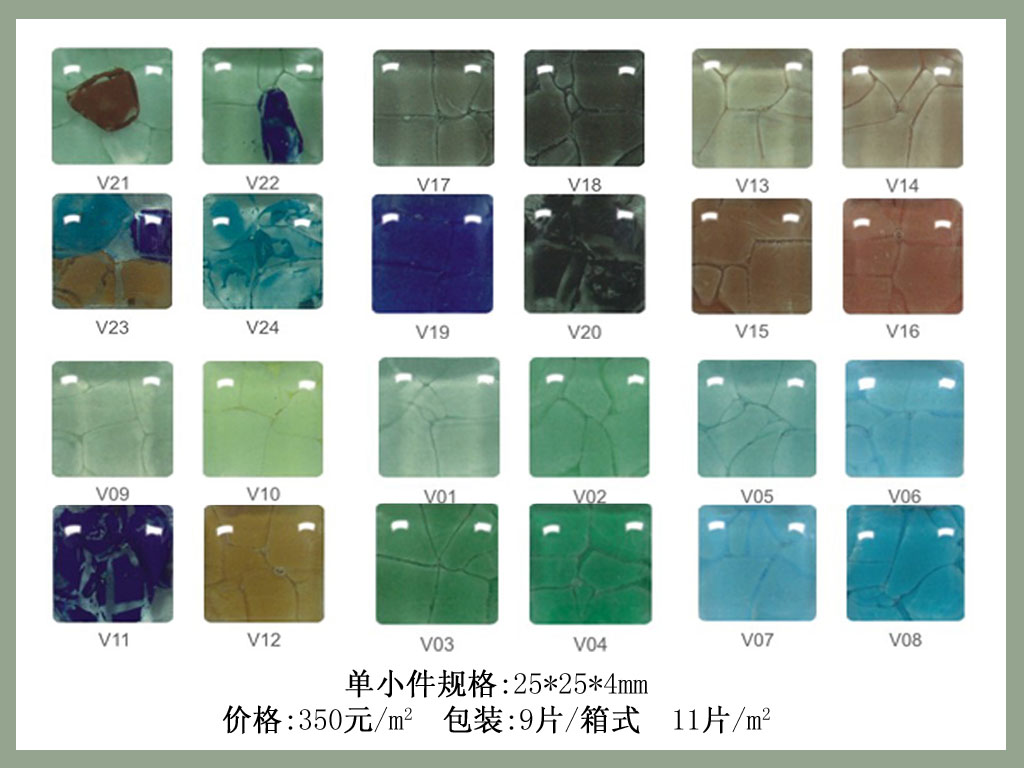 水晶玻璃马赛克系列:每颗规格:25mm×25mm×6mm每片规格:300mm×300mm每平方:350元;每平方需11片;每箱重量:17KG;每箱可装:16片亮迪佳水晶玻璃马赛克适用于浴室、厨房、客厅、游泳池,酒吧等场所,给人一种时尚,清新的感觉。产品有多种规格,能组成混贴,渐变和幻彩,亚光系列。