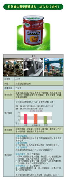 适用温度:450℃以下 适用对象:金属材质之商业用烤箱、开饮机内胆、电热炉、烘培设备、汽车底盘、引擎室等 喷涂位置:对象设备内外壁 功能诉求:远红外线辐射加热--节能、省时、提升生产质量与产能  效 益:防锈蚀、耐刮磨、防沾黏污垢 组织成分:硅酸盐胶变性树脂+奈米远红外线素材