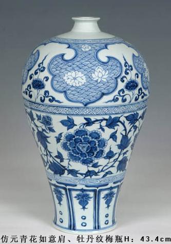 仿元青花如意肩、牡丹纹梅瓶