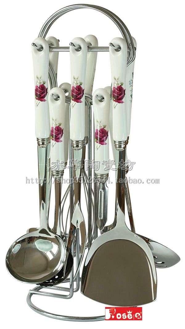 【品牌】皇家玫瑰 【产地】韩国 【等级】一等品 【材质】骨质瓷、一级不锈钢 【内容】锅铲1支、大汤勺1支、汤勺1支、漏勺1支、刮皮刀1支、粉抓1支、二齿叉1支、水果刀1支、小打蛋器1支、瓶启1支、架子1支 【规格】厨具长28cm,不锈钢架高39cm,底盘直径15cm 【花式】一支玫/皇家玫瑰/蓝玫瑰/茶花/意大利玫瑰