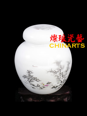 基本信息:产品编码:CJ-CG-XC-A003产品名称:精品细瓷粉彩"山川秀色"茶叶罐产品规格:H*Φ*Φ=10*9*9包装材料:锦盒包装
