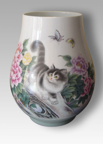 粉彩猫蝶伏桶手绘瓶