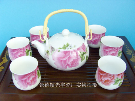 纯手工绘制的釉中彩图案栩栩如生,清新淡雅.配有锦盒包装,自用送礼两相宜. "茶"是回归清凈的良方。一份茶香、一份闲情,三五好友、或个人独处,泡茶品茗、随意又自在。 要泡一壸香醇甘味的好茶,最重要的就是冲泡过程和杯壸。好的茶器具组合搭配最爱的茗茶,可使身心同时获得解放。也是人生一大享受 。陶作坊作品皆符合人体工学,是兼具艺术及实用价值的现代品茗器具! 景德镇市光宇陶瓷厂位于“中国瓷都”――景德镇。其产品经江西省景德镇市光宇陶瓷研究所工程师精心研究设计,精选上乘高岭瓷土,做工精细,经高温烧成后瓷质细腻、如脂如玉、晶莹剔透、高贵典雅,手感、口感、眼观与众不同,釉面温润柔和、色泽高贵典雅。瓷质刚坚强韧、晶莹剔透,具有良好的热稳定性,耐高温,抗冲击强度高,并经中国检验认证集团江西有限公司检验,其含铅、铬、镉低于国际标准。是现代家庭、高级酒店、机关单位、企业家首选日用陶瓷的佳品。是星级宾馆、高级餐厅首选用瓷,深受海内外客商的青睐。
