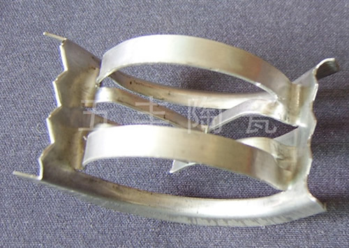 金属矩鞍环,这种填料的形状介于环形与鞍形之间,因而具有两者之优点。结构上金属矩鞍环在鞍形基础上增强了环形筋,避免了重叠,保证了一定的强度与刚性,冲出了几个小爪,增强了所液搅动,强化了传质,从而产生了独特的性能,是现今最优秀的散堆填料之一。
