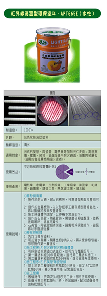 一、产品概述 光波奈米环保耐温涂料 (水性/高温型) PT665E 适用温度:1000℃以下 适用对象:非金属材质之石英管、陶瓷管电热管加热组件、中低温电热炉及各式窑炉 喷涂位置:加热组件表面 功能诉求:远红外线辐射加热--提高加热效率、节能、省时  效 益:平均节省能源10~18% 组织成分:硅酸盐胶+奈米远红外线素材 外 观:灰色液体 喷涂厚度:45~50um 喷涂面积:2~3平方米/kg 干燥温度:500~600℃ 稀释溶剂:水 稀 释 比:7~10% 黏 稠 度:60rpm-520 固 形 份:40min-55.54% 比 重:1.493(水=1) P H 值:>8(弱碱性) 使用说明:1、涂料经稀释后需搅拌均匀,再以250目滤网过滤为最佳。 2、加热组件需先清洁表面,或做喷砂粗糙处理;为免手接触影响附着性,以戴手 套施工为宜。 3、建议以喷涂施工为佳。