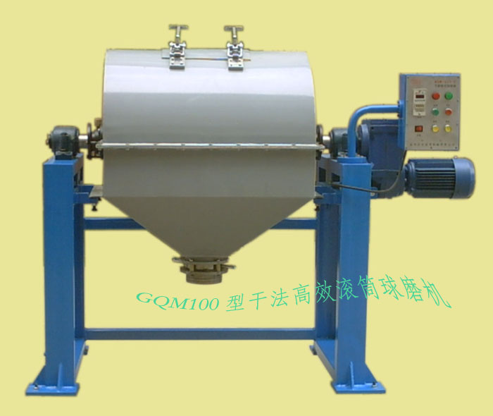 干法球磨机、干法卧式球磨机、干法滚筒球磨机-GQM型干法高效滚筒式球磨机是一种采取干法的形式对物料进行粉磨的设备。该机由球磨罐和回收罩两部分组成。工作过程是:打开回收罩窗盖和球磨罐筒盖,把下料斗放进球磨罐内,物料通过下料斗加到球磨罐内,盖上球磨罐罐盖及回收罩窗盖,即可开机工作。干法高效滚筒球磨机在连续粉磨过程中,研磨到所需粒度的物料通过安装在球磨罐上的万孔筛筛分出来,落到回收罩内,而相对较粗的物料滞留在球磨罐内继续研磨,故不作无用功,能高效研磨物料。干法高效滚筒式球磨机工作一段时间后,就可打开回收罩放料阀,放出磨好的物料。GQM-T型干法高效滚筒式球磨机可广泛在磁性材料、药物原料、陶瓷原料、玻璃原料、金属粉末、合金粉末、稀有金属提炼等行业使用。 GQM型干法高效滚筒式球磨机具有以下特点:(一)罐体转速优化设计,可使球磨罐体内的介质球形成倾流式运动分散物料,获得最佳的研磨效果,能较快的把物磨细料。(二)该机为直联式传动结构,由电动机驱动斜齿轮减速机,减速机输出空心轴直接套在磨球罐传动轴上,并装有减速机启动减冲击垫。具有传动扭矩大,机械效率高,启动平稳的特点,并免除了经常性调整传动带带来的麻烦。(三)该机采用了数显时间控制器控制,根据需要可随时设定工作时间,并具有暂停、累加定时控制功能,操作省时省力,轻松方便。(四)回收罩密封严密,不会对周围环境造成污染,出料口采用大口径90旋阀放料阀,使用特别方便。 说明:(1)该机适合容重在5以下的物料,容重大于5时,需另订做。(2)基本型为碳钢材料制造,也可为用户订做不锈钢、锰钢或氧化铝瓷、氧化锆瓷、尼龙、聚氨酯、耐磨橡胶等内衬球磨机。(3)也可根据用户需要,选配变频器调速。规格有70升、100升、200升、300升、500升、1000升、1500升。