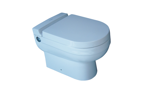藏墙门控式自动冲洗器节水型落地坐便器GHM0333 无水箱,冲洗系统直接连接自来水,每次用水量2升左右,排污管道管径达DN55~DN80,横排出水,出水口离底端130mm。