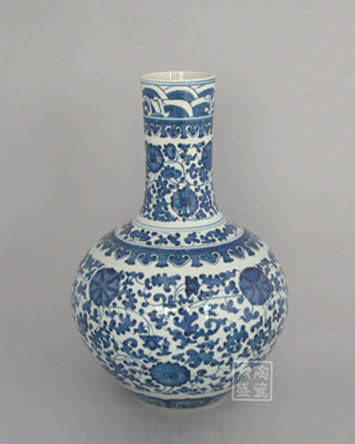 【商品编号】YS0607017【商品说明】青花穿枝莲天球瓶【商品规格】高33cm 口径7cm【所属类别】青花类