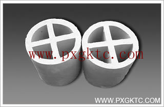 十字隔板环填料是基于增加填料的比表面积,从而强化传质效率而开发出来的。其形状是在拉西环中间增设了十字隔板。一般来讲,这种填料由于尺寸较大,仅适用于整体堆砌,目前一般只作为乱堆填料的塔底支撑分布层用。 ø80-150mm规格的十字隔板环可作支承材料,空隙率大于60%,个数为整聚数。