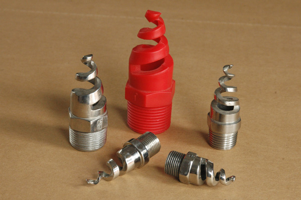 螺旋喷嘴 6300系列螺旋喷嘴能产生实心和空心锥形两种喷雾形状,该类喷嘴是通过液体与连续支小的螺旋线体相切和碰撞后产生的小水滴喷出,碰撞外形的独特设计,最大程度的减少了阻塞现象,是一款结构紧凑,环保形的喷嘴,可提供喷雾夹角从60-170°,3公斤压力下喷量从5.5至4140升/分钟,螺纹从1/4至4寸选择,也可提供法兰和内螺纹接口,一般采用不锈钢,塑胶材料制造,也可提供黄铜,铁氟龙,碳化硅,陶瓷、合金、PE等各种特殊耐酸碱,耐腐蚀,耐磨材料。 一般应用:脱硫,脱硝 冷却,除尘 前处理无阻塞喷淋 6300系列涡流型脱硫喷嘴能产生空心锥形喷雾形状,喷雾区域成环形,喷雾角度有窄角45-52°,标准角度60-86°。该类喷嘴能在大范围的流率和压力下产生分布均匀,液滴大小为中等到偏大的喷雾。整体设计的涡流系列喷嘴可用多种耐磨材料(碳化硅,氮化硅)等材料制造。该类喷嘴规格一般有2英寸,3英寸,4英寸,6英寸。广泛应用于电厂脱硫脱销、水冷却、充气、化学处理等! |