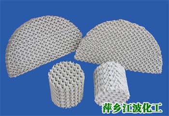 陶瓷波纹填料具有比表面积大、能量大、阻力小、效率高、耐腐蚀、耐高温(可达1000℃以上)、操作弹性大、放大效应不明显等优点,特别适用于对压降和理论板数有严格要求的高温腐蚀性物料的精馏、吸收等分离过程。 | 理化性能 | 耐酸度 ≥ 99.8% 耐温度 ≥ 1000℃ | 莫氏硬度 ≥ 7 抗压强度 ≥ 2.0 Mpa | | 主要技术指标: | | 型号 | 比表面积 m2/m3 | 空隙率 kg/m3 | 堆积重量 kg/m3 | 峰高 mm | 波距 mm | 片厚 mm | 理论板数 m-1 | 最大F-因子 m/s.(kg/m3)0.5 | 压力降 Pa/m | | 450 | 450 | 75 | 520-550 | 6.0±0.5 | 12±0.5 | 1.0-1.3 | 3-4 | 1.8-2.0 | 200-250 | | 400 | 400 | 76 | 500-520 | 7.0±0.5 | 14±0.5 | 1.0-1.3 | 2.8-3.2 | 2.0-2.2 | 180-260 | | 350 | 350 | 78 | 480-520 | 8.0±0.5 | 16±0.5 | 1.2-1.5 | 2.5-2.8 | 2.2-2.6 | 200-260 | | 250 | 250 | 82 | 420-450 | 11.0±0.5 | 22±0.5 | 1.2-1.5 | 2.3-2.5 | 2.6-2.8 | 220-280 | | 160 | 160 | 86 | 350-380 | 17.0±0.5 | 34±0.5 | 1.5-2.0 | 1.8-2.0 | 2.8-3.0 | 250-300 | | 125 | 125 | 87 | 300-350 | 23.0±0.5 | 42±0.5 | 2.0-2.5 | 1.5-1.8 | 3.0-3.2 | 280-350 | | 100 | 100 | 90 | 220-250 | 30.0±0.5 | 50±0.5 | 2.0-2.5 | 1 | 3.5 | 250-300 |