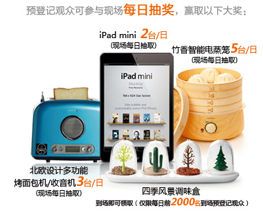 每日前2000名到场预登记观众,可获价值“四季风景调盒”1套,并有机会参与现场抽奖,赢取Ipad Mini以及更多时尚家用产品(见右图)。