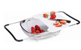 瓜果蔬菜等食材可以置于篮内,将伸缩篮展开后置于水槽两端,冲洗篮内的食材或瓜果。洗净后可将篮内杂质丢到垃圾桶。本品最大的特点就是在洗净瓜果或蔬菜的同时,不含果皮,菜叶的清水会过滤到水槽内,从而节 约用水。选配的小菜板可直接装置在篮子上,切块分装更简单。无论在厨房或是在客厅都会得心应手。